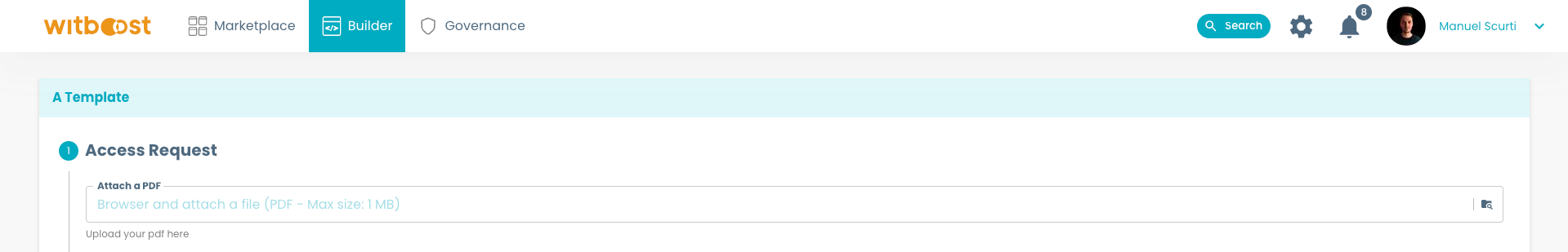 With a FilePicker you can ask users to attach a file within a template. The file won't be stored in witboost, but it can be passed to the actions configured in a template leveraging nunjucks.
